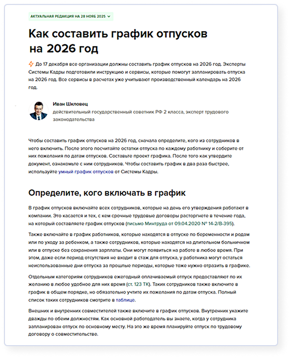 Это готовые однозначные решения по кадровой работе, которые включают все риски и позиции всех ведомств. Клиентам не надо тратить время, чтобы самим найти и проанализировать информацию. Все заключения подкреплены ссылками на НПД и судебку, а также учитывают изменения в законодательстве и практике.