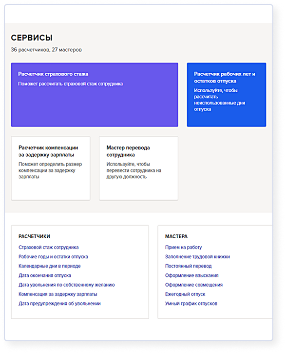 Удобные расчетчики и мастера, которые не ошибаются и учитывают все изменения в законодательстве. Полезный инструмент для экономии времени и автоматизации ежедневных задач: чтобы посчитать страховой стаж сотрудника и остатки отпусков, определить дату окончания отпуска и рассчитать компенсацию за задержку зарплаты.